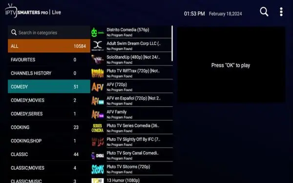 Depending on your internet connection, this may take a few seconds. After that, you’ll see your full channel list ready to stream. At this stage, you can explore live TV, movies, series, or even customize your favorites for quicker access.